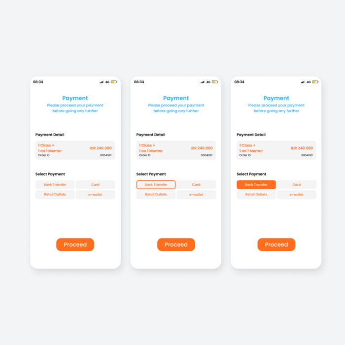 Dalam page payment proses hover and click seperti yang tergambar di atas. Setelah user melakukan pembayaran, maka muncul page levelling untuk menentukan user akan belajar dari level mana.